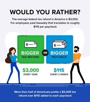 About half of Americans would rather get a bigger tax refund than an extra $115 per paycheck, according to a recent survey Credit.com conducted. But a bigger tax refund isn't always a good thing. Learn more about what you can do with a larger paycheck.