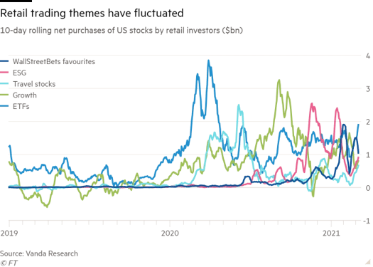 As Financial Times data shows, retail investor interest fluctuated wildly across 2020 and 2021, with the dominant presence of ETFs giving way to travel, growth, ESG, and meme stocks at various stages.